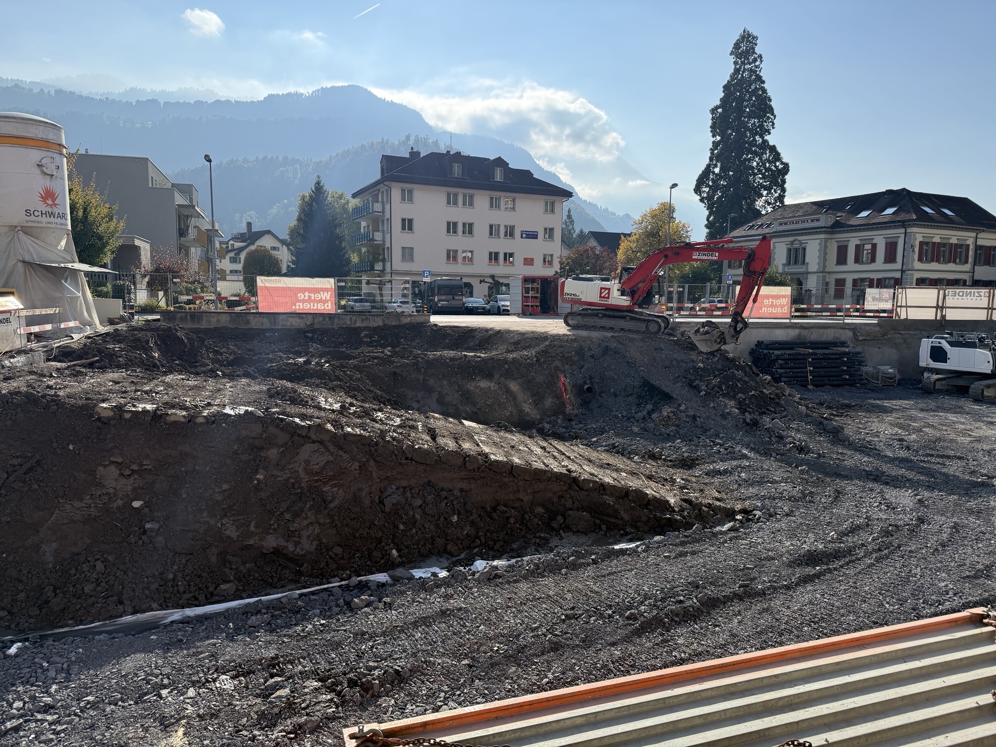 Aushub mit Böschungssicherung und Ortsbetonpfählen.