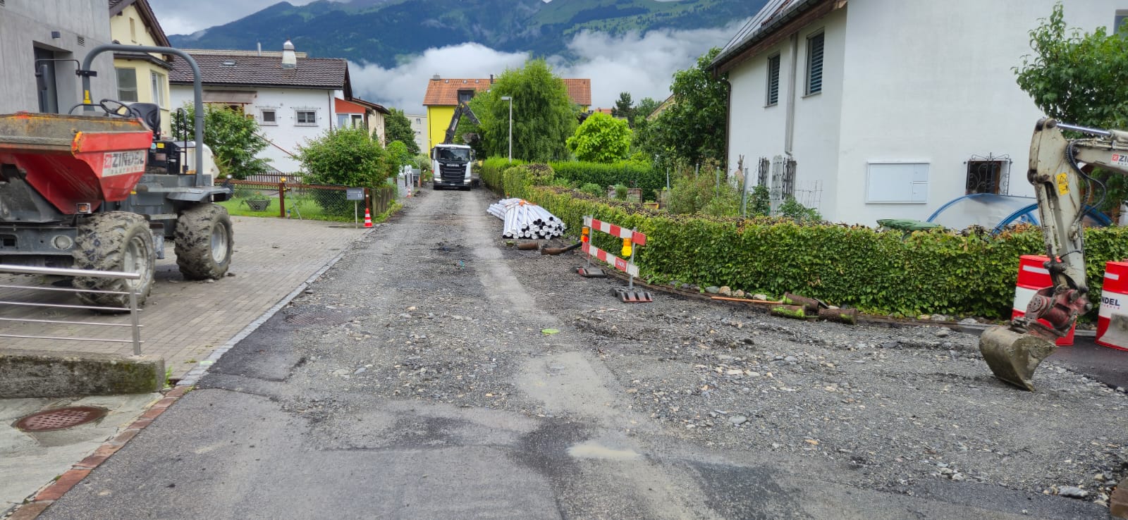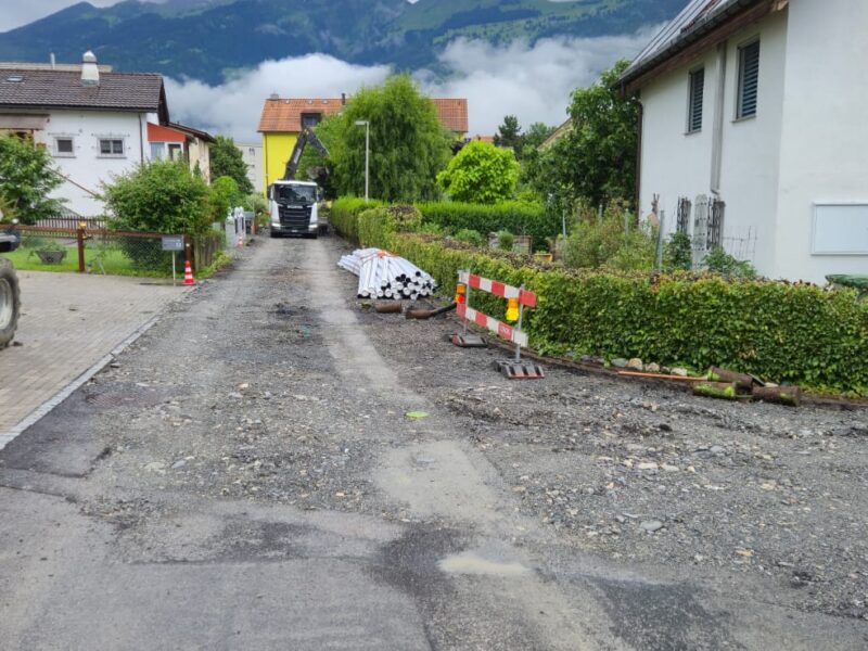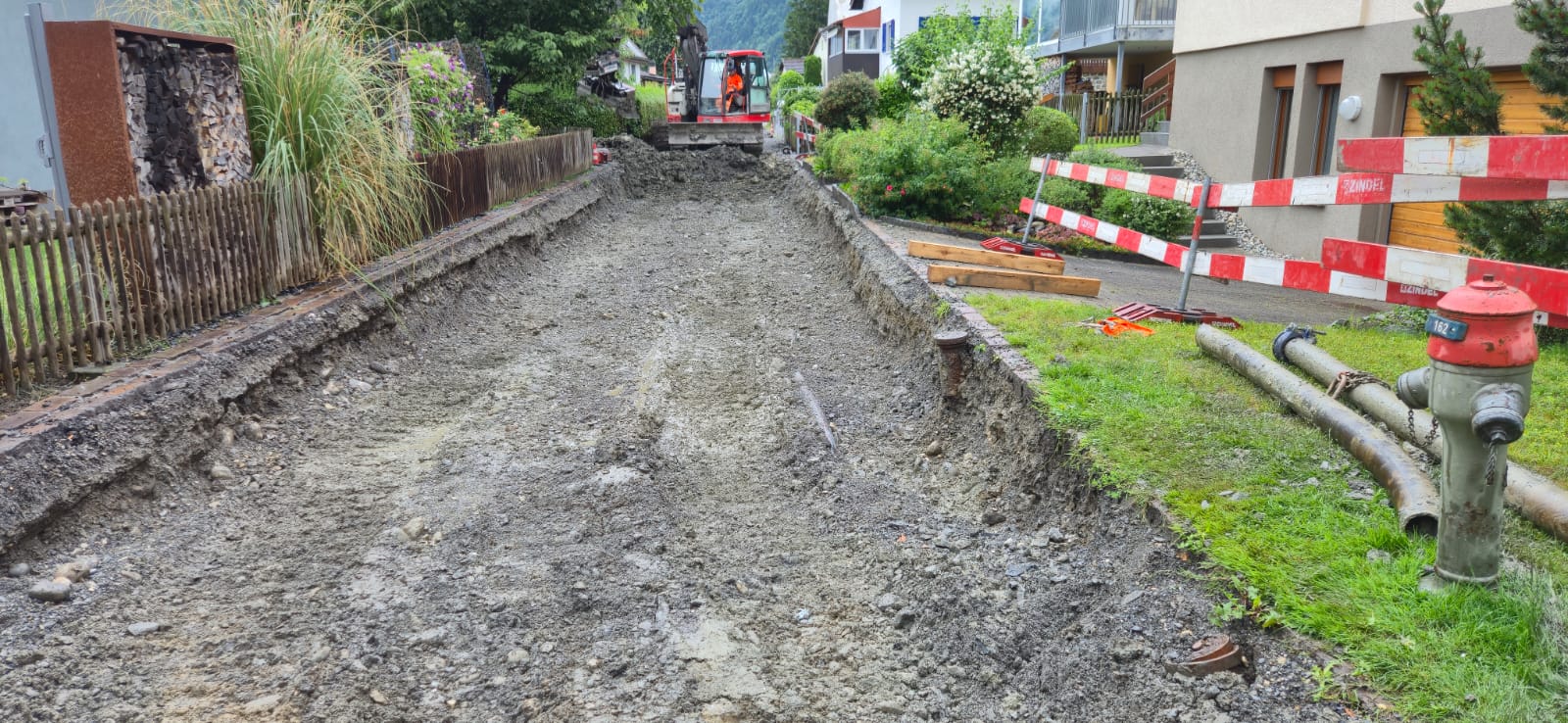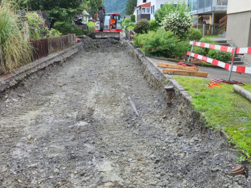 Erneuerung Hauptwasserleitung und Werkleitungen. Erneuerung Fundationsschicht und Belag.
